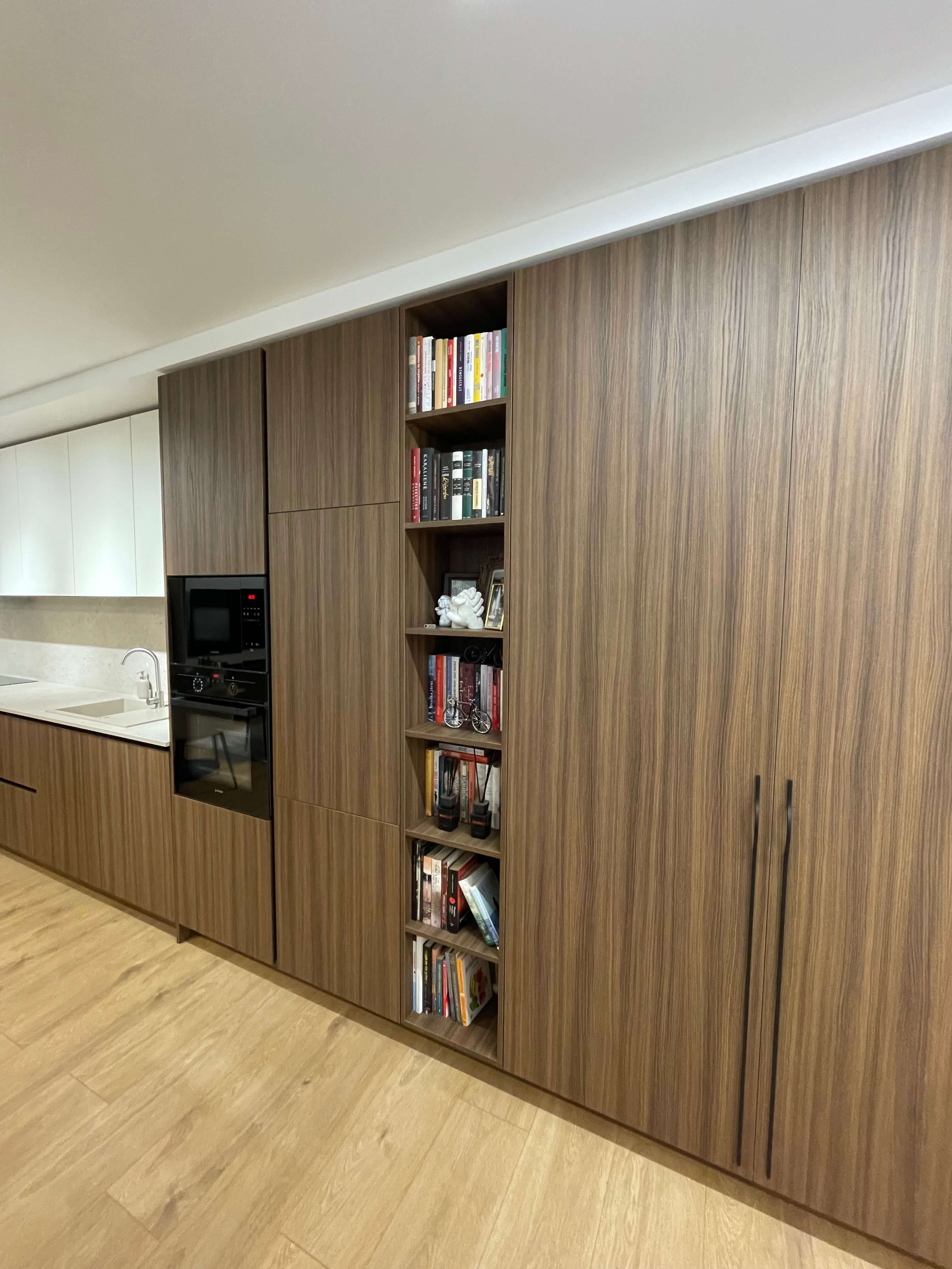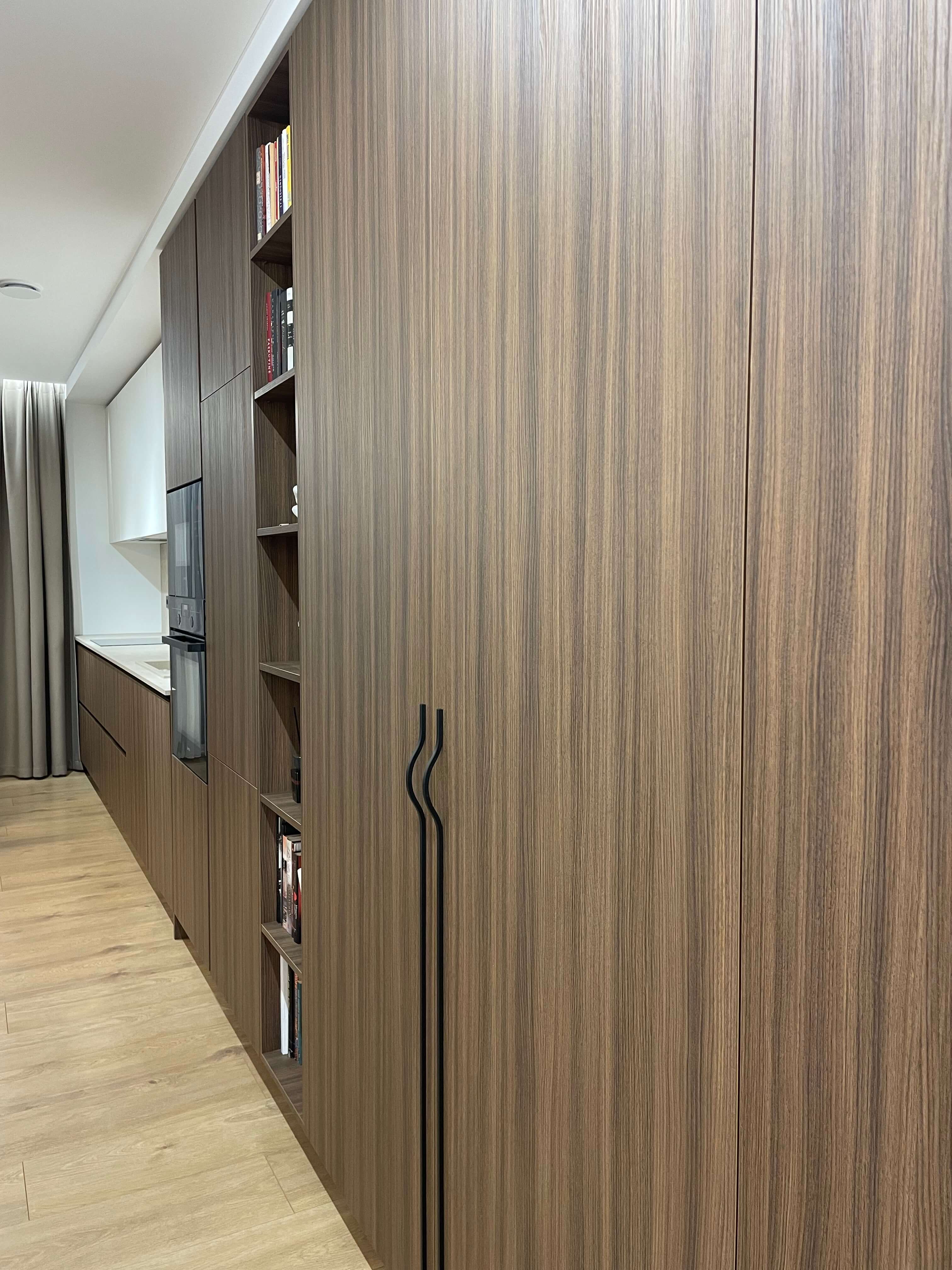 The project is an example of functionality and full utilization of space without losing aesthetics. Using modular furniture and uniform wood texture panels, two areas are seamlessly merged, saving space while maintaining design harmony.