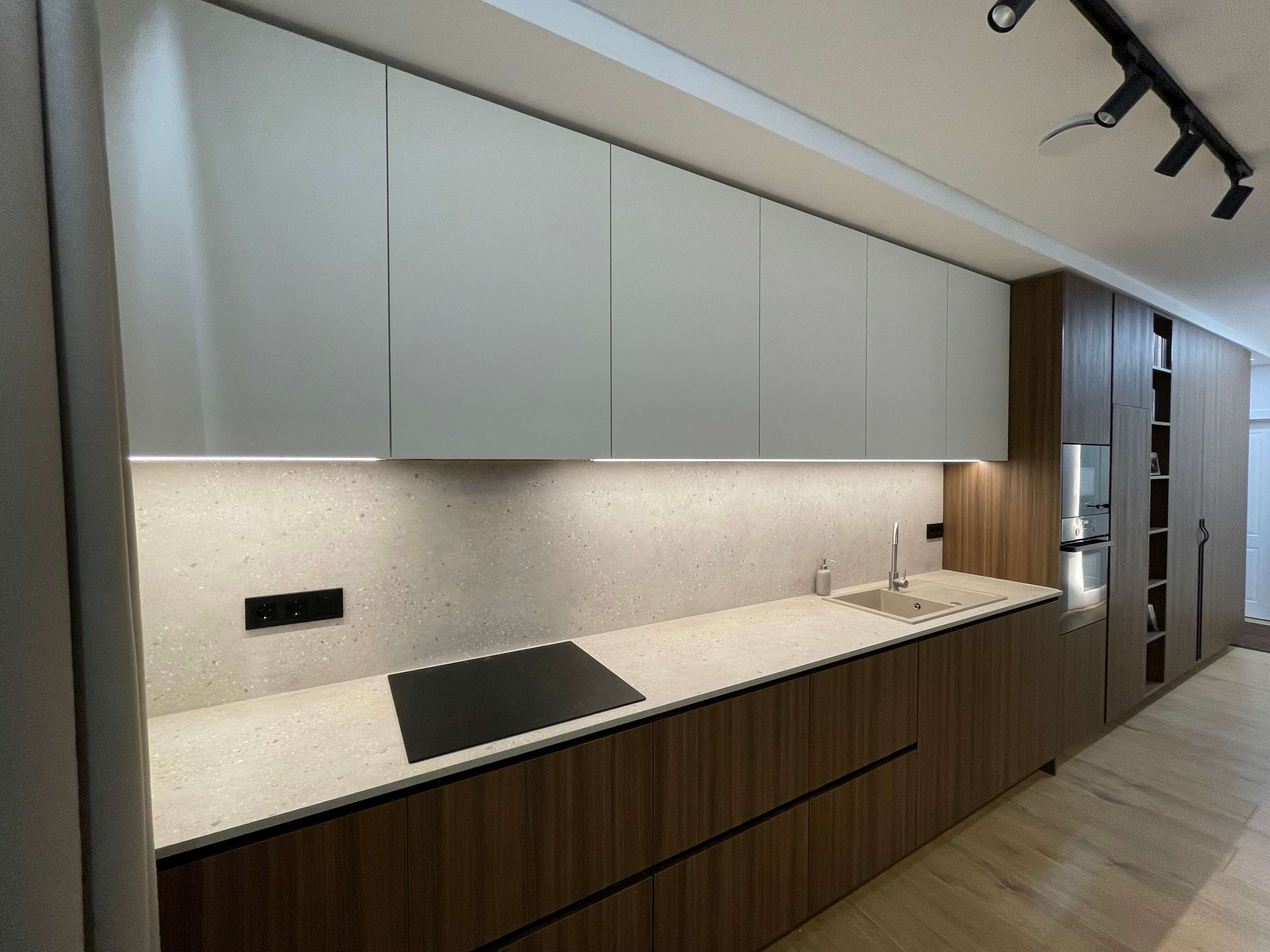 Kitchen Furniture: nearly 5-meter long kitchen with a 19 mm thick countertop adding lightness and elegance. Dimmer LED lighting installed under the hanging cabinets. Faceless fronts, a choice increasingly popular among clients, using GOLA profile handles.