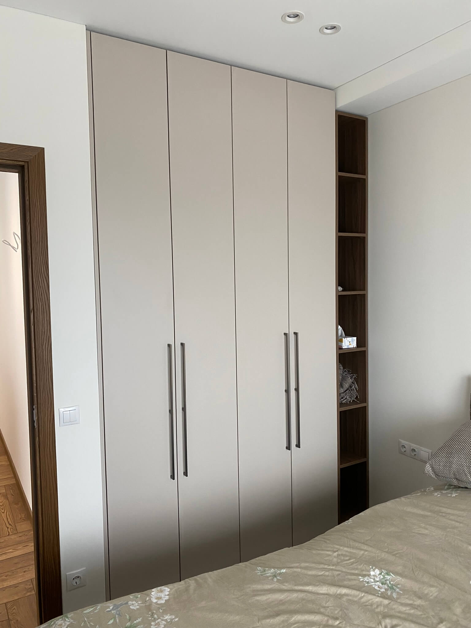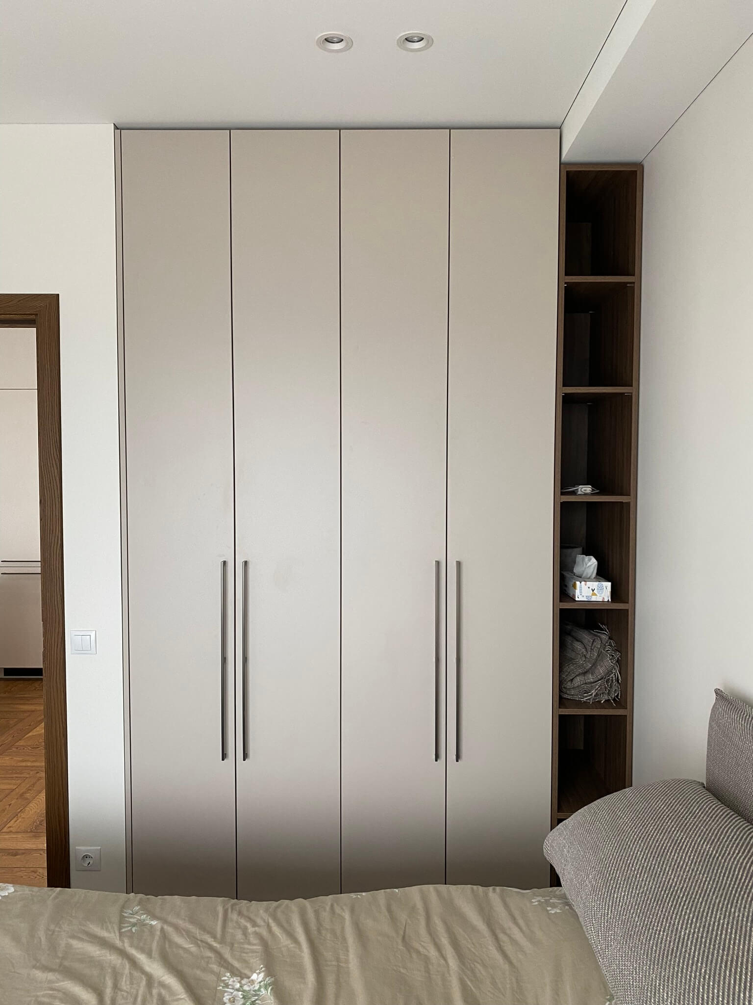 Bedroom Wardrobe: A minimalist design wardrobe with metal handles. A practical structural solution that adapts to uneven ceiling surfaces.