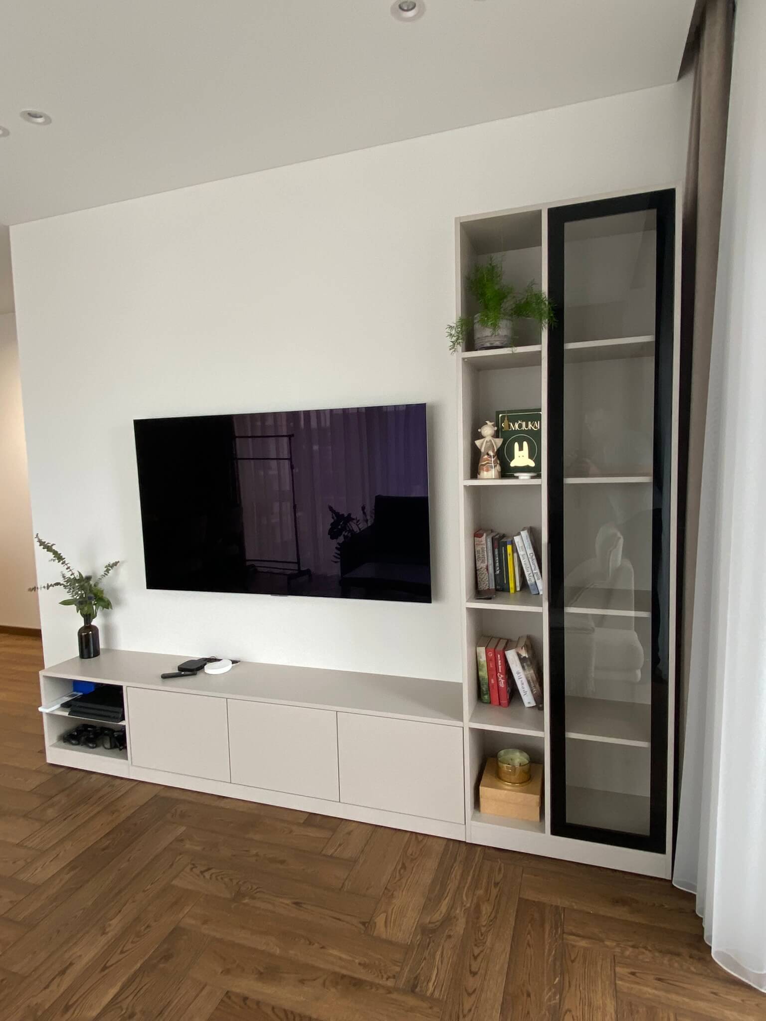 Living Room Furniture: A minimalist design TV area that combines both closed and open spaces for items. Glass doors with a black aluminum frame accent add lightness to the furniture and draw the design closer to classic style.