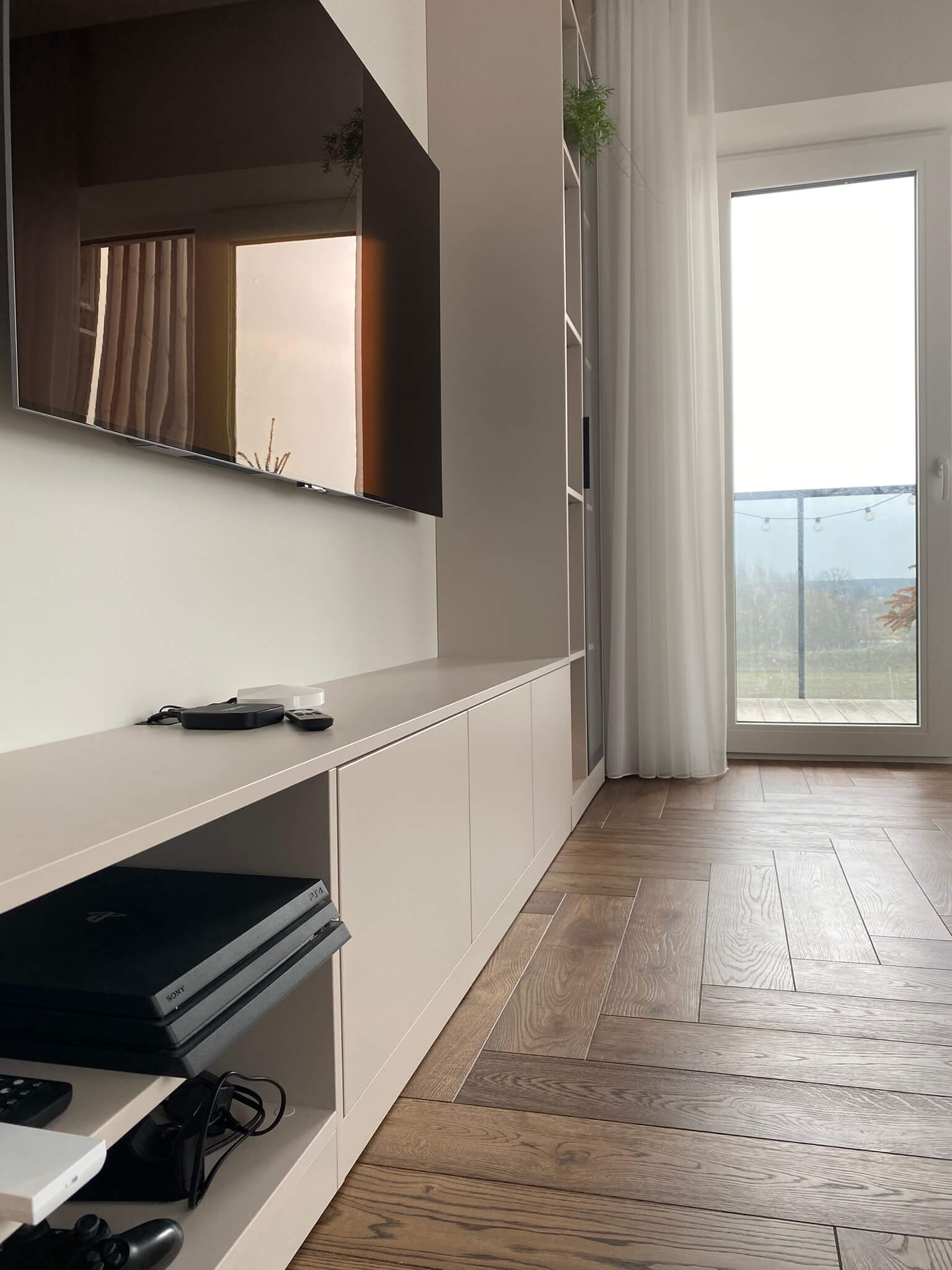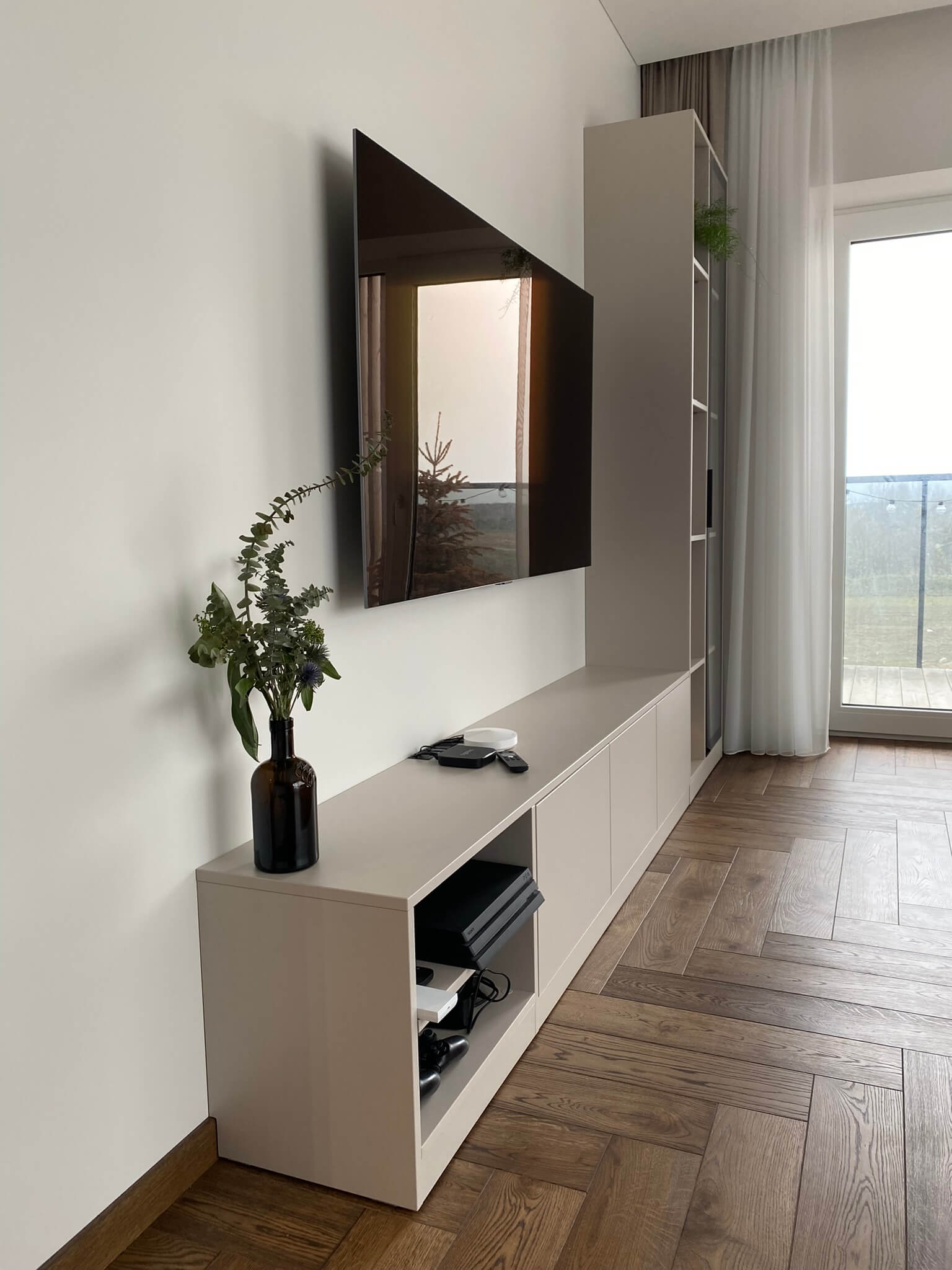 The project features functional solutions - a TV unit combined with a cupboard, and a spacious bedroom wardrobe. The bathroom includes integrated laundry equipment, ensuring optimal use of space and convenience.