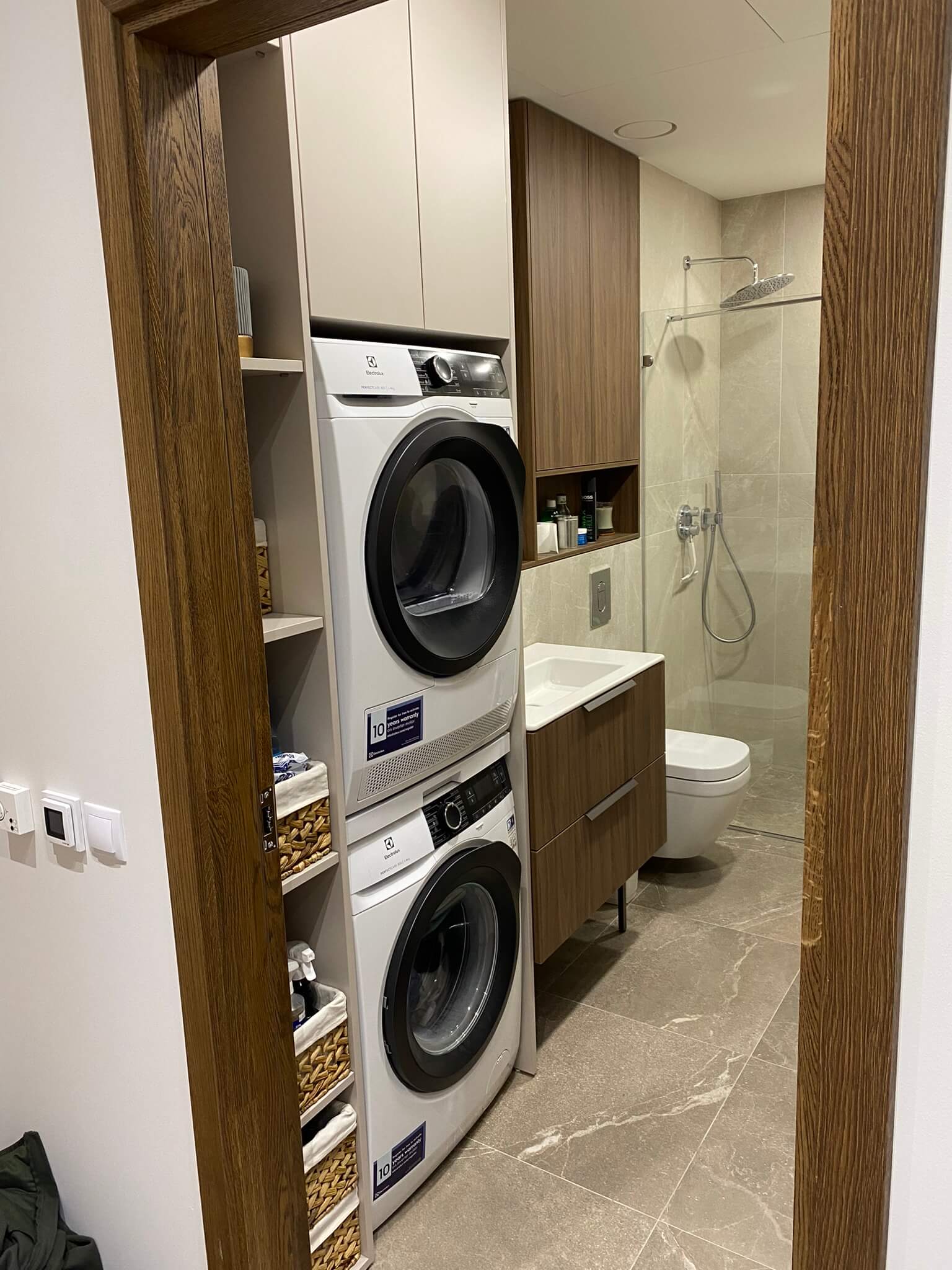 Bathroom: The furniture combines functionality and aesthetics - integrated laundry equipment, wood-textured cabinets, and open shelves create a practical and stylish space.