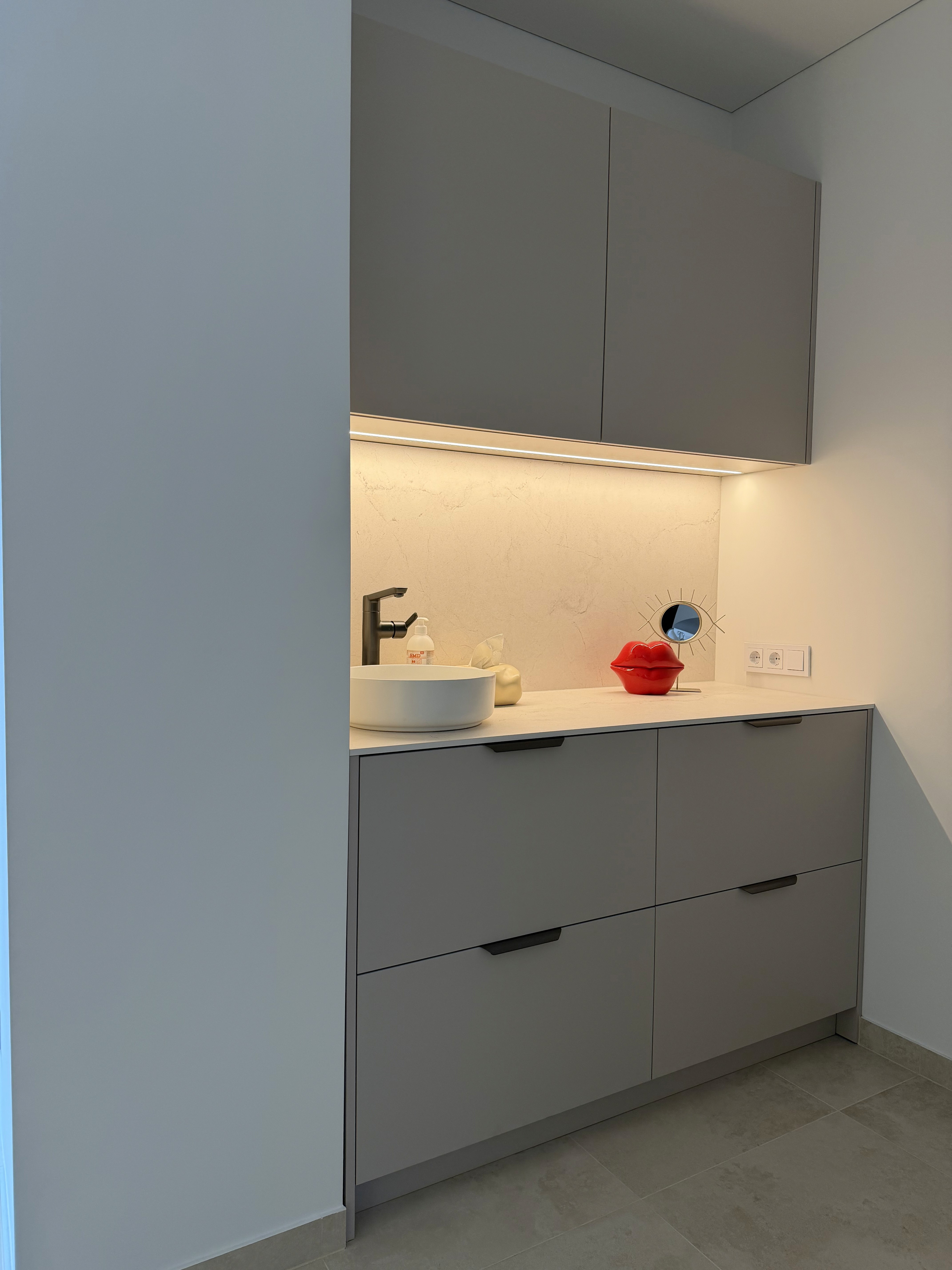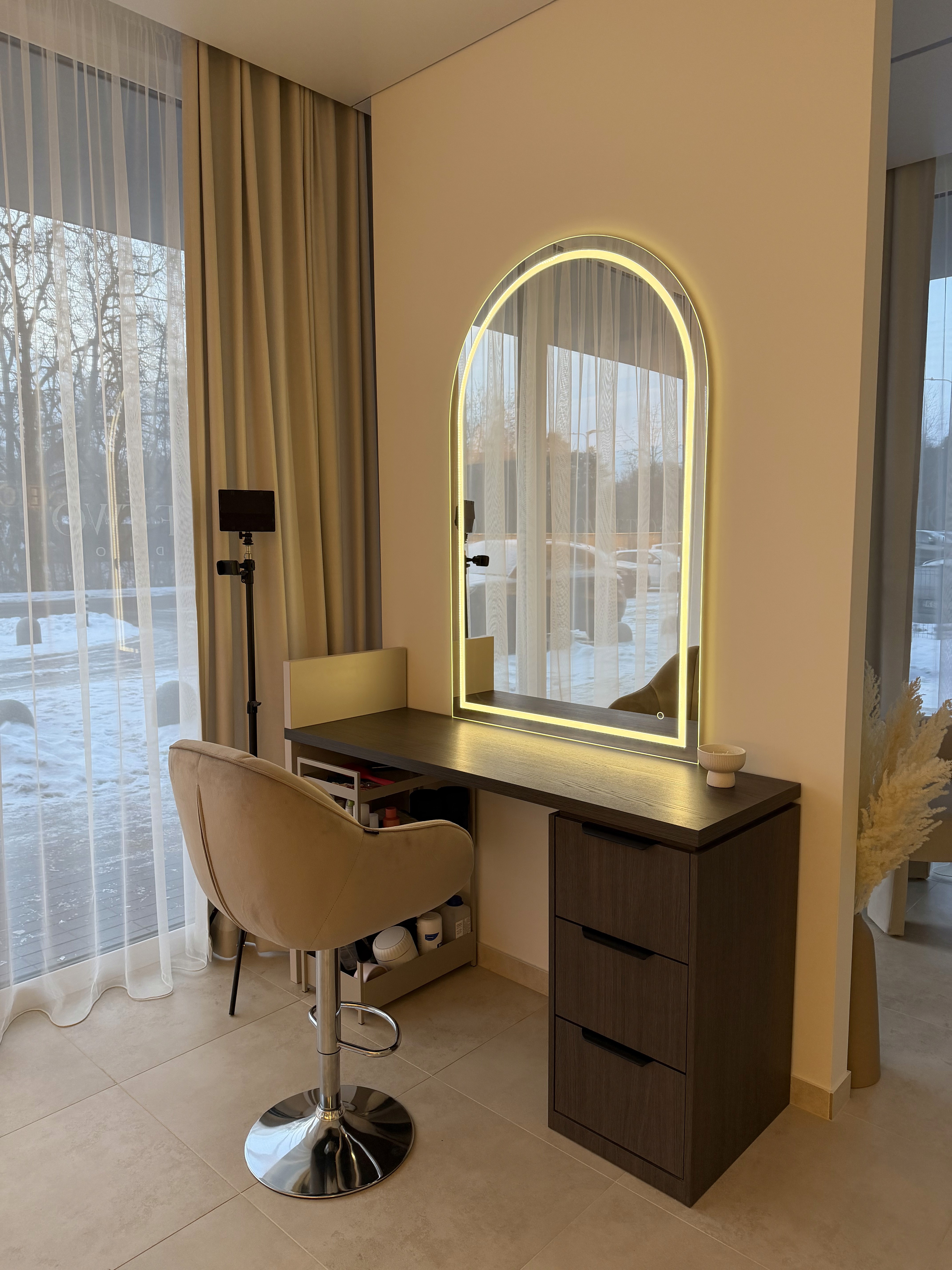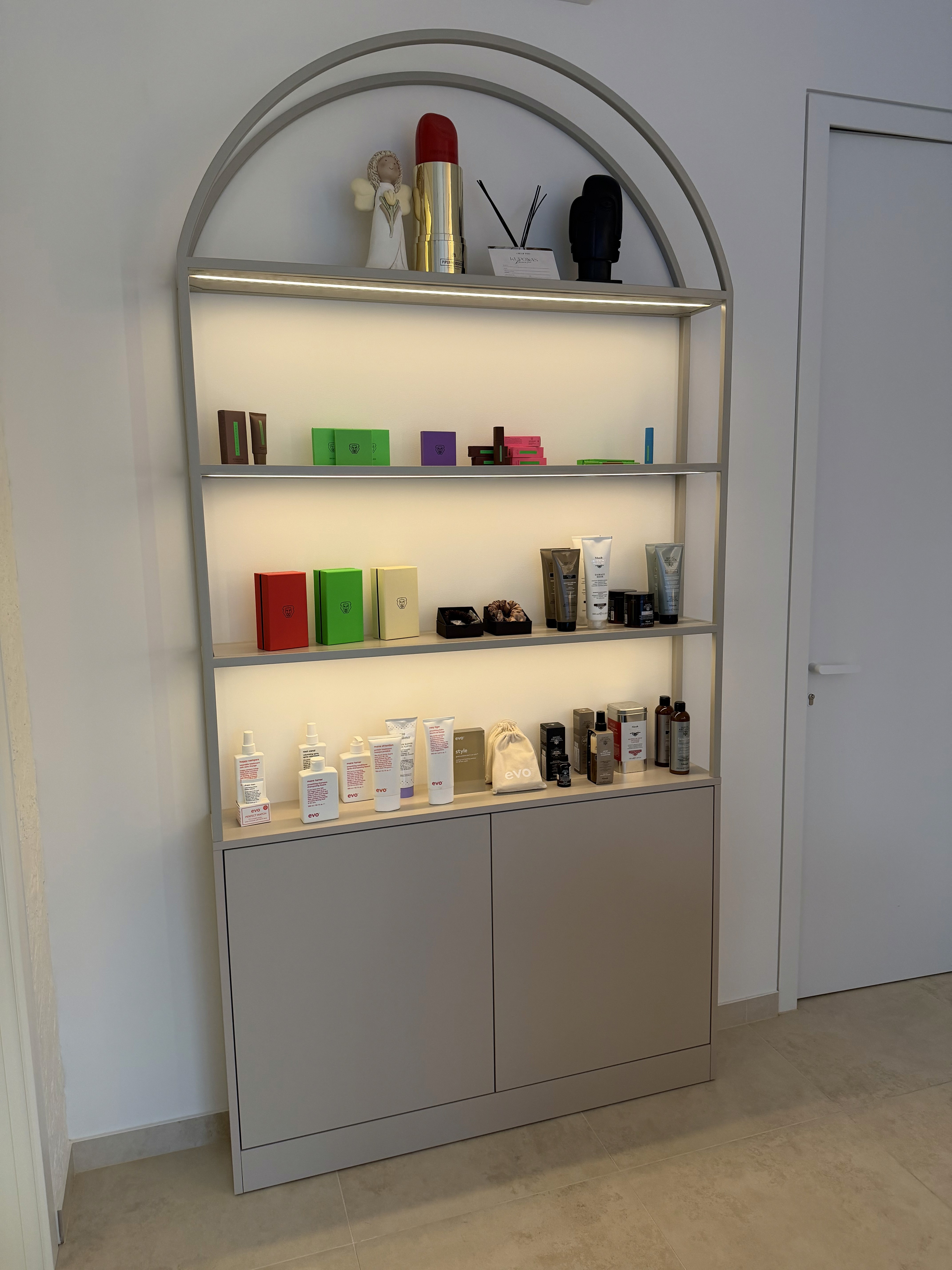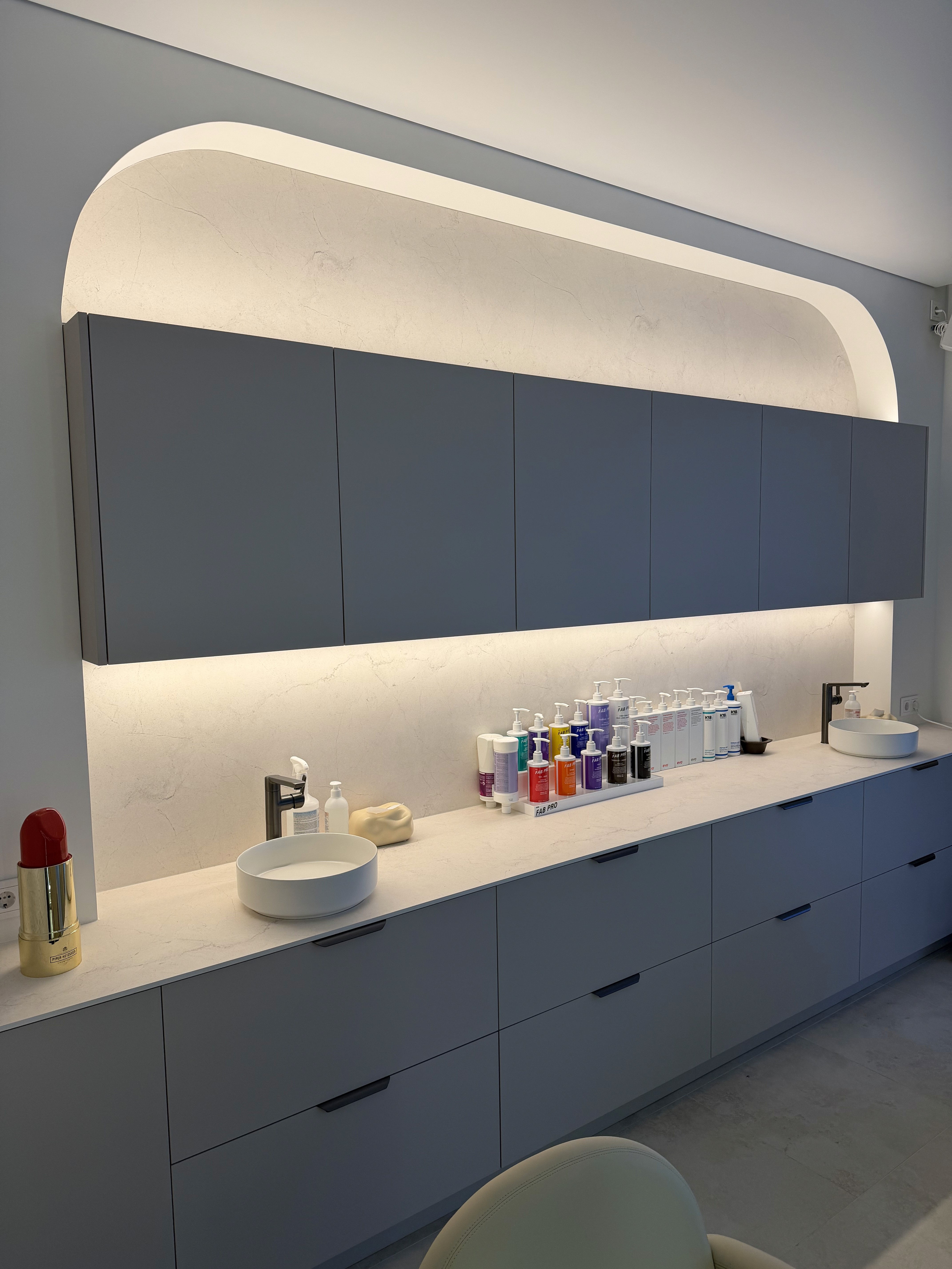 Šiame grožio salono interjere vyrauja daug lenktų formų ir žinoma ryškaus apšvietimo, kuris būtinas paslaugas teikinat grožio specialistams. Taip pat, buvo svarbu integruoti kuo daugiau patogių, lengvai prieinamų ir talpių erdvių priemonių laikymui.